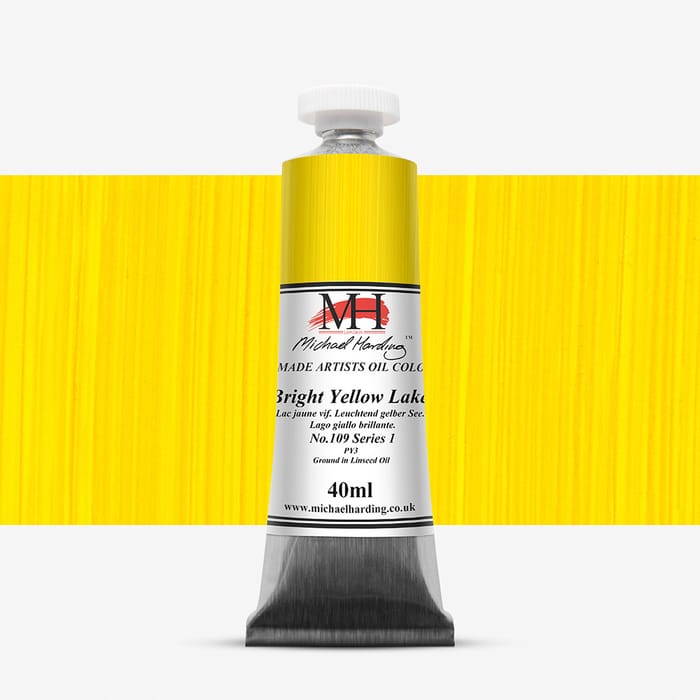 Bright Yellow Lake is an arylide organic lake pigment. It has an incredibly high oil content and transparency, with an enormous tint power that shoots through mixes with a pervasive range of bottle green undertones. Beginners should handle this paint with care when adding it to other paints. It can heighten the Phthalo Lakes without making them opaque, and when it is made itself opaque with the addition of white, the results are almost luminous.