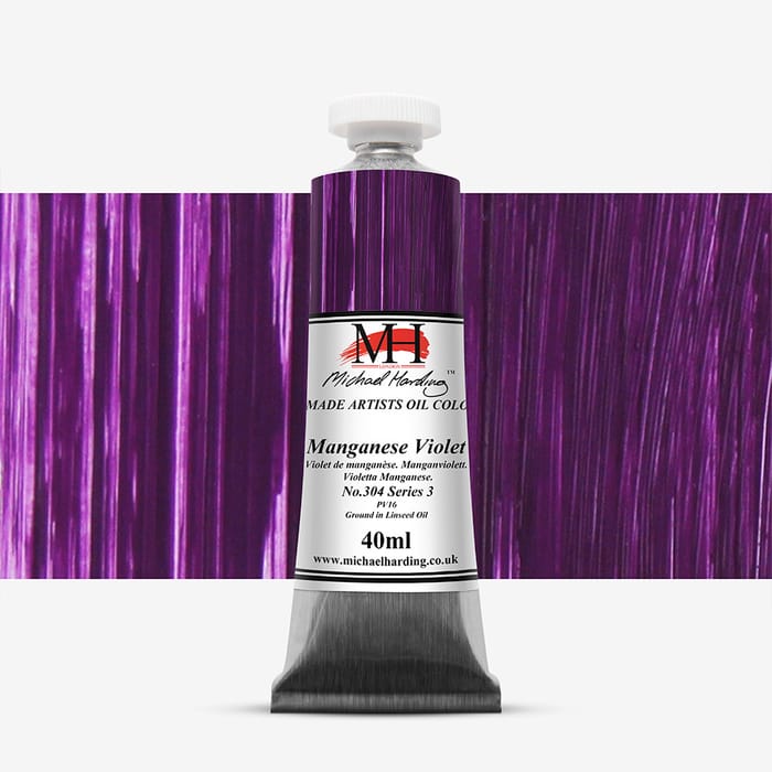 Manganese Ammonium Pyrophosphate is a bold, heavy Violet that was first made in Germany in 1868 as one of the mid-19th century wave of synthetic inorganic metal salts that prompted a change in artists’ palettes. Manganese Violet has mild, reddish overtones that do not cut through mixes and that some find useful when making reflex or shadowy greys. Its average tint power allows it to be added without greatly lowering the tonality of the result.