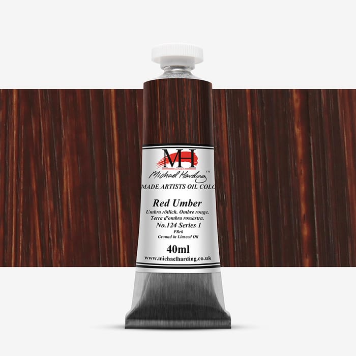 Red Umber is a synthetic iron oxide. this pigment had lighter and redder characteristics than those it assumed when manufactured in animal bladders. Raw Umber is calcinated to make the pigment, and the amount of Manganese Dioxide mixed with the Iron Oxide determines the range of undertones; my formulation is much warmer than is usual.